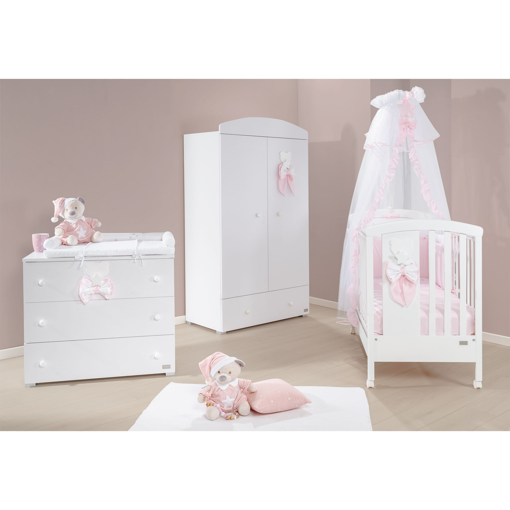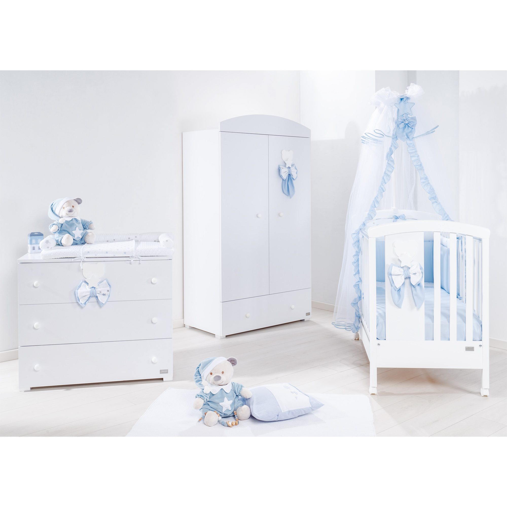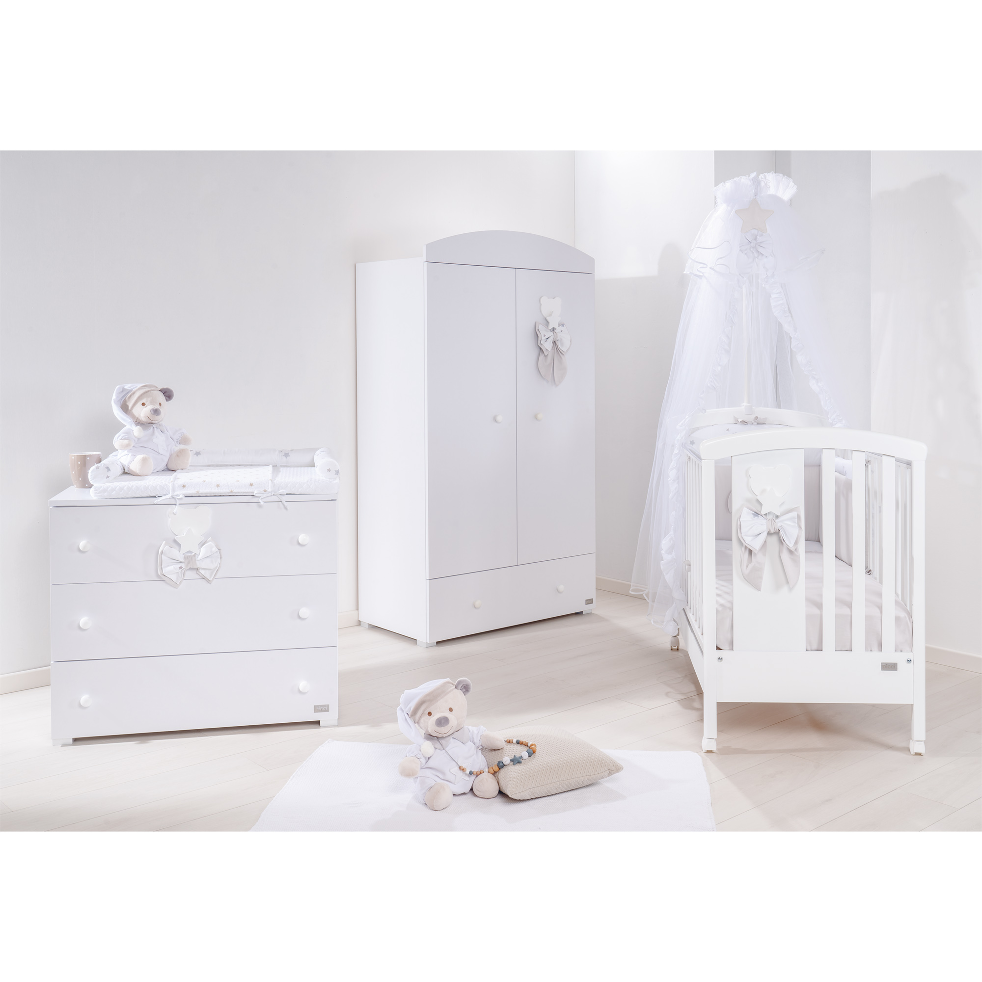 Armadio bianco con cassetto, pomoli bianchi e decoro Orso/Stella.