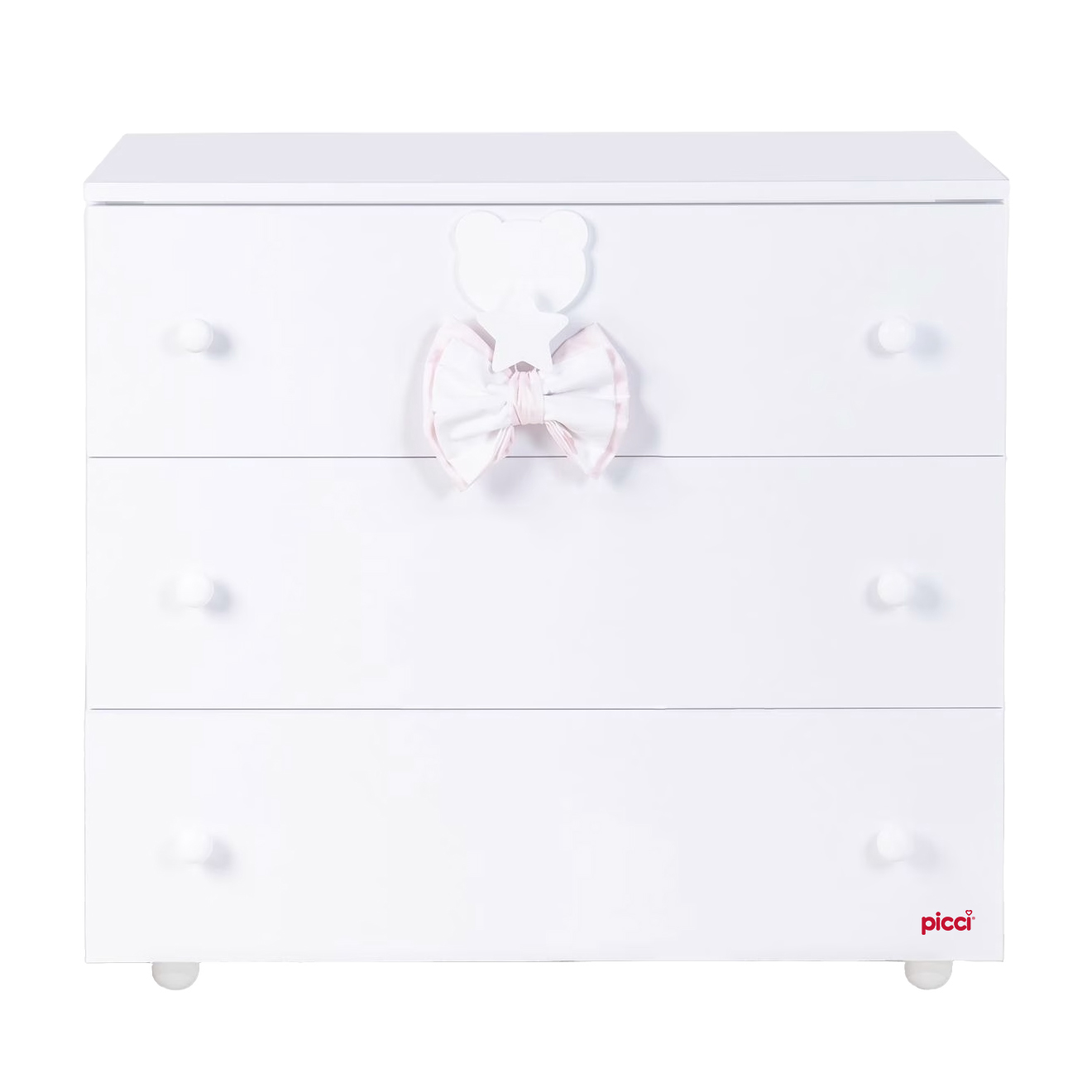 Comò bianco a 3 cassetti con pomoli pallina e decoro Orso/Stella.