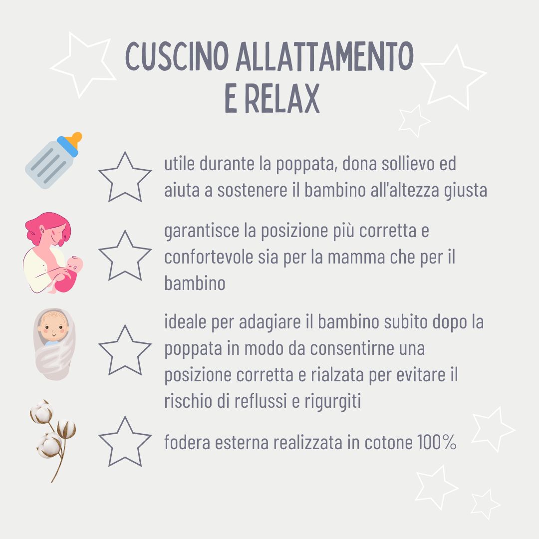 Il cuscino allattamento è uno strumento indispensabile che semplifica il lavoro delle neo mamme. Pensato per sorreggere il peso del bambino durante l’allattamento, garantisce la posizione più corretta e confortevole sia per la mamma che per il bebè. Fodera esterna realizzata in cotone 100%, grazie alla soffice imbottitura interna è un ottimo alleato che consente una buona digestione del bambino che vi può essere adagiato subito dopo la poppata in modo da mantenere la sua schiena in posizione rialzata e ridurre il rischio di reflussi e rigurgiti.