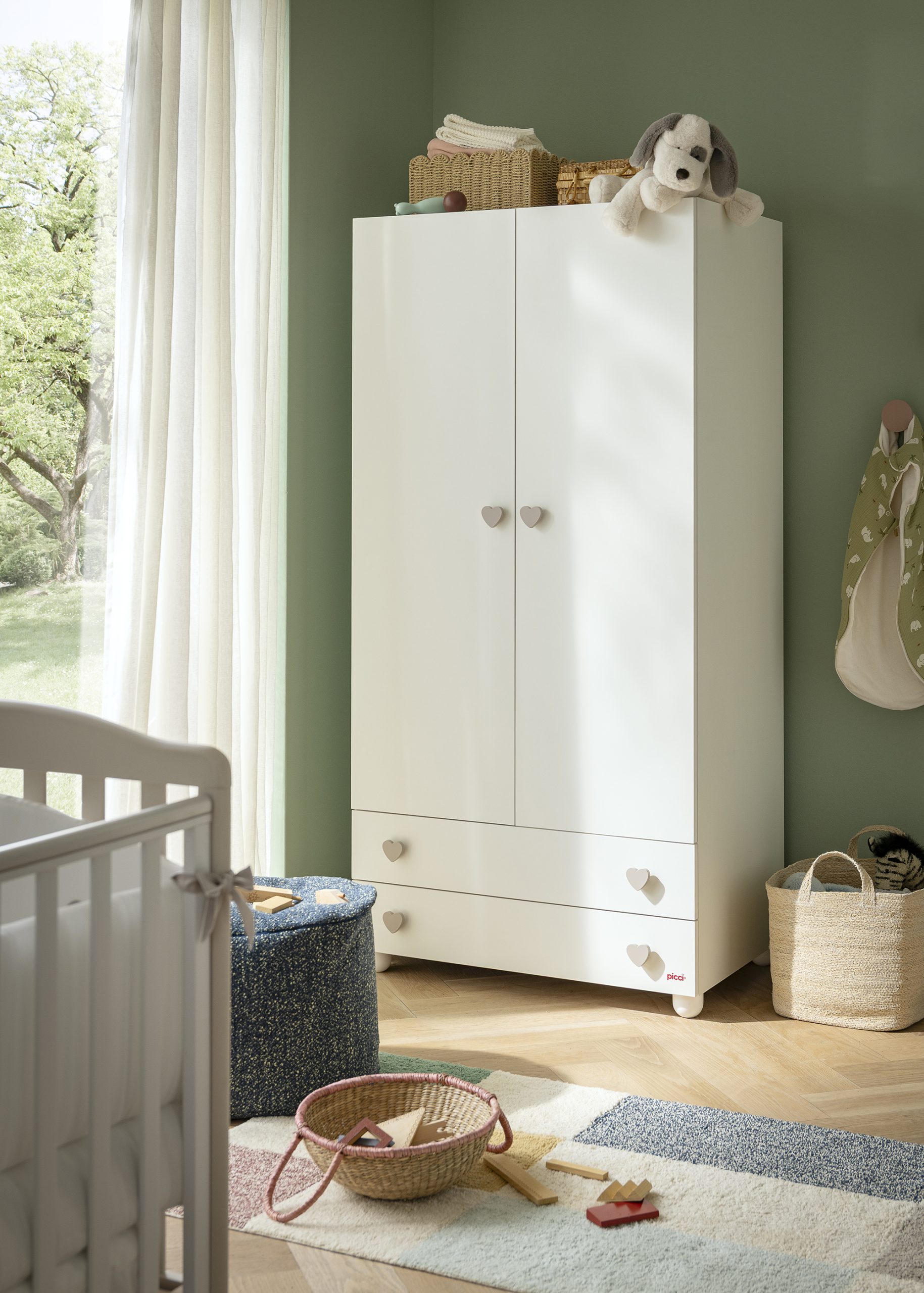 L’armadio Piccini a 2 ante e 2 cassetti unisce funzionalità e dolcezza, diventando un elemento pratico e armonioso nella cameretta. La finitura bianca è impreziosita da pomoli a forma di cuore, disponibili nelle varianti bianche o color champagne, che richiamano il tema delicato della collezione.