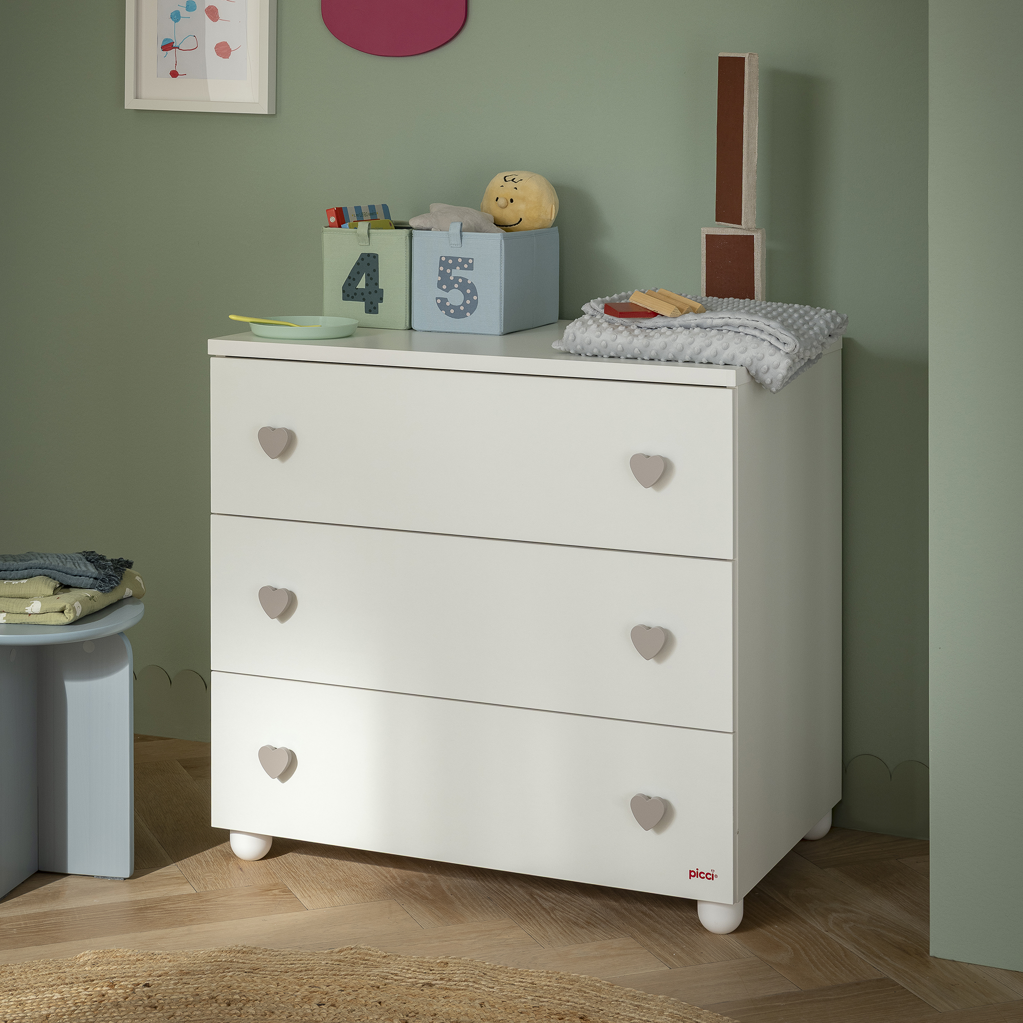 Il comò Piccini a 3 cassetti unisce praticità ed eleganza, completando la cameretta con uno stile dolce e armonioso. La finitura bianca è arricchita da pomoli a forma di cuore, disponibili nelle varianti bianche o color champagne, in perfetta continuità con il tema della collezione.