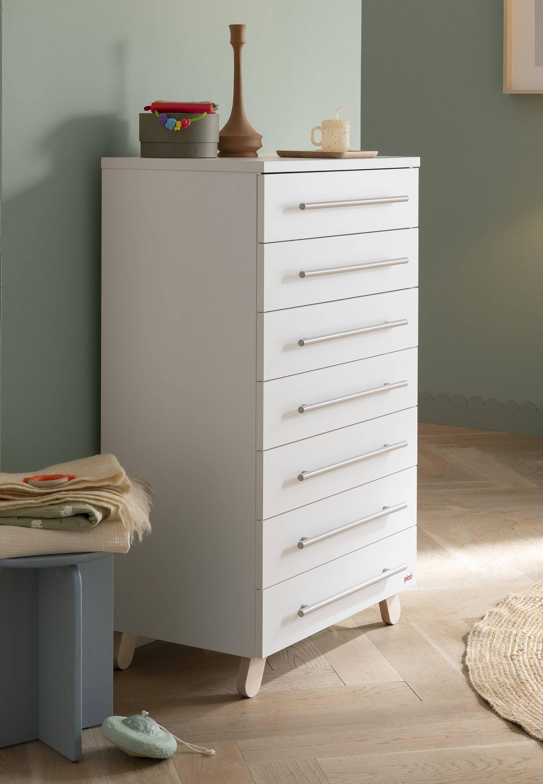 Il settimino Swing è una soluzione pratica per organizzare al meglio la cameretta del bambino. Il design essenziale in bianco si abbina facilmente agli altri mobili della collezione.