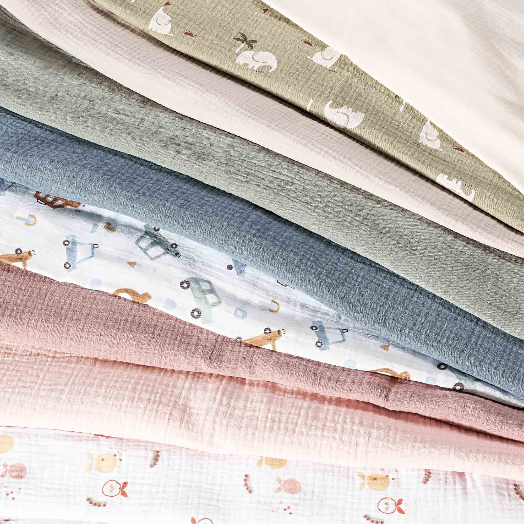 Il set è composto da 3 swaddle in mussola di cotone organico: un pezzo a fantasia e due pezzi in tinta unita.